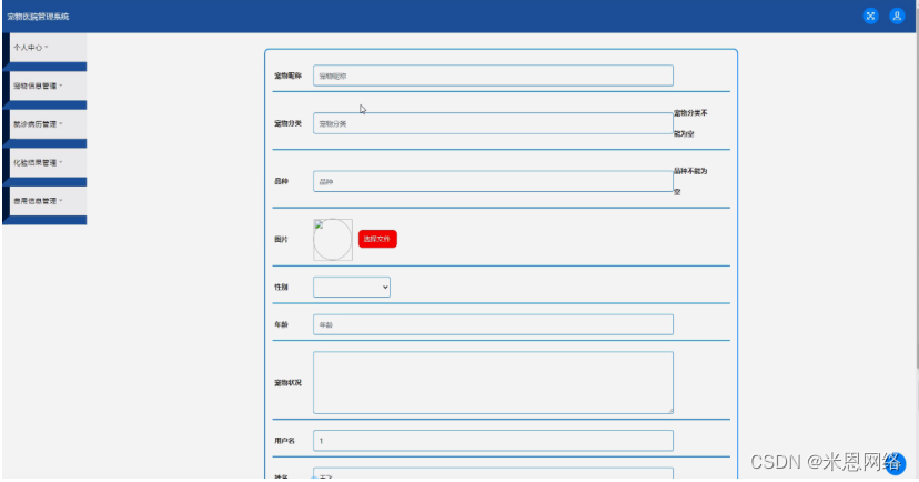 用户进入到系统后台,可以对个人中心、宠物信息管理、就诊病历管理、化验结果管理、费用信息管理等功能进行相应的操作,用户功能页面如图5-3所示。