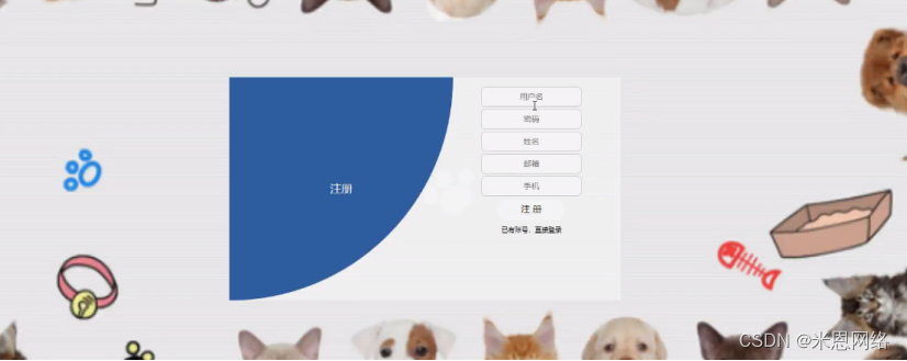用户需要登录宠物医院管理系统,要先进行注册,点击用户注册,通过输入用户名、密码、姓名、邮箱、手机等信息进行注册,用户注册如图5-1所示。