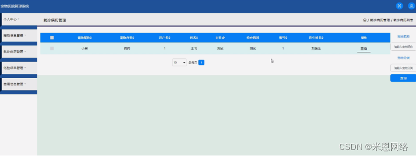 在就诊记录管理页面,用户可以查看宠物昵称、宠物分类、用户名、姓名、过往史、检查情况、账号、医生姓名等信息,如图5-6所示。