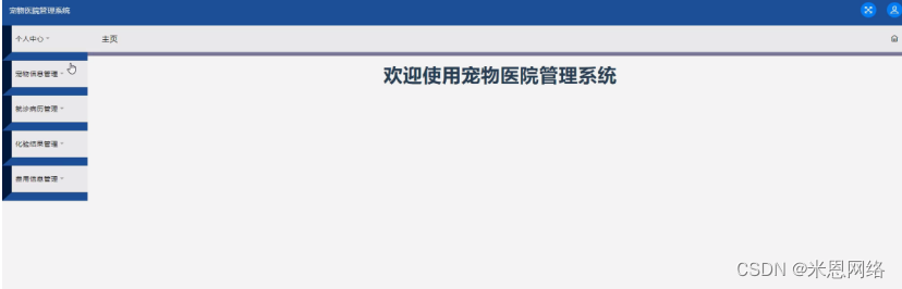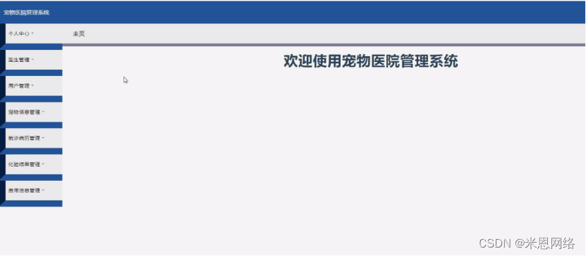 管理员登录系统后,可以对个人中心、医生管理、用户管理、宠物信息管理、就诊病历管理、化验结果管理、费用信息管理等进行相应的操作管理,如图5-9所示。