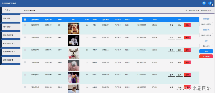 宠物信息管理,在宠物信息管理页面可以对宠物名称、宠物分类、品种、图片、性别、年龄、宠物状况、用户名、姓名、手机、状态等内容进行查看、修改、删除等操作,如图5-12所示。