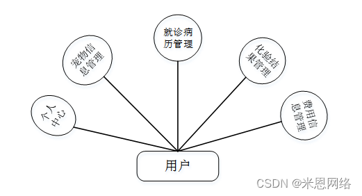 (b)用户进入系统可以实现个人中心、宠物信息管理、就诊病历管理、化验结果管理、费用信息管理等功能。用户用例图如图3-2所示。