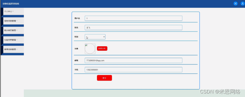 点击个人中心,用户可以对用户名、姓名、性别、头像、邮箱、手机等内容进行修改,还可以输入登录密码,用户个人中心页面如图5-4所示。