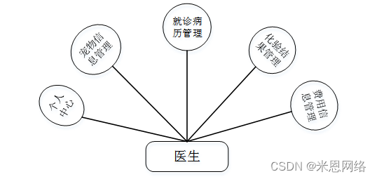 (c)医生进入系统可以实现个人中心、宠物信息管理、就诊病历管理、化验结果管理、费用信息管理等功能。用户用例图如图3-2所示。