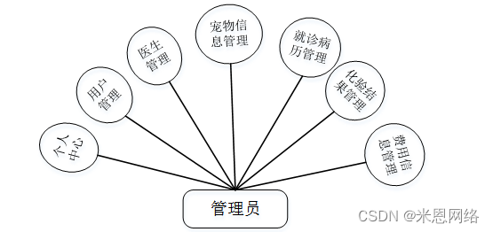 本系统主要是实现对宠物医院的管理,主要由管理员、用户、医生三个用户进行操作,本系统没有设置前台,管理员、用户、医生只需要登录到系统后台,就可以对相关信息进行操作,网站整功能如下图所示:
