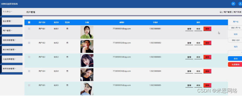 用户管理,在用户管理页面可以对用户名、姓名、性别、头像、邮箱、手机等内容进行查看、修改、删除或批量删除等操作,如图5-10所示。