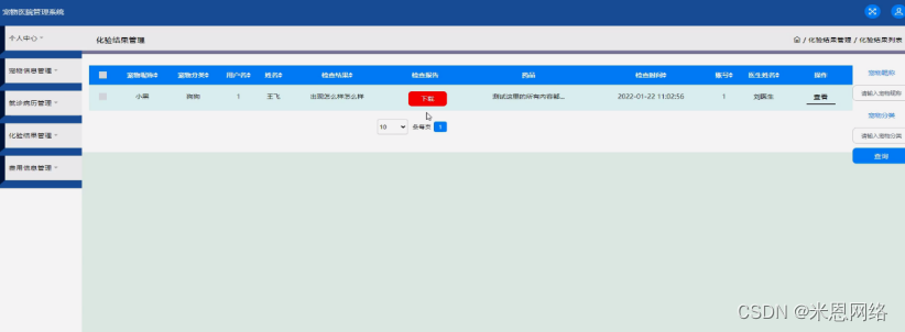 在化验结果管理页面,用户可以查看宠物昵称、宠物分类、用户名、姓名、检查结果、检查报告、药品、检查时间、账号、医生姓名等信息,用户还能下载检查报告,化验结果管理页面如图5-7所示。