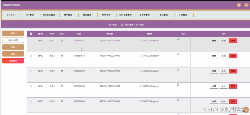 用户管理,管理员可在用户管理页面查看账号、姓名、性别、手机、邮箱、身份证、照片等内容,还可进行添加、修改或删除等操作,如图5-9所示。
