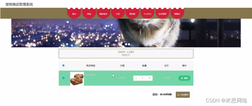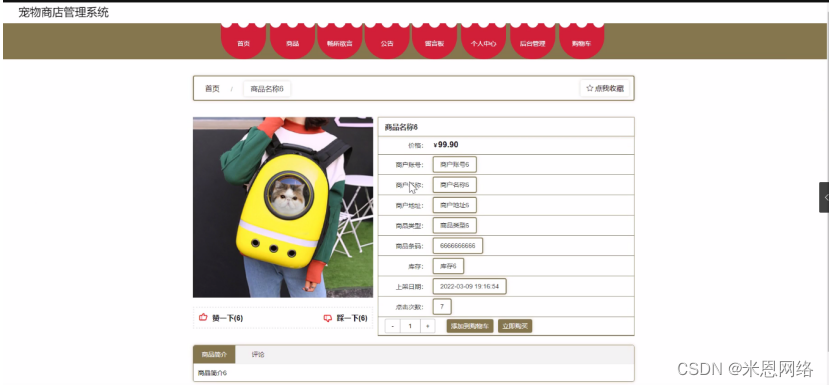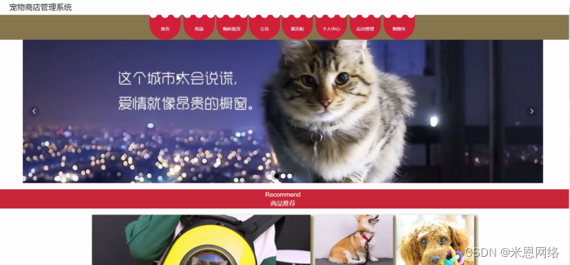 宠物商店管理系统,在系统首页可以查看首页、商品、畅所欲言、公告、留言板、个人中心、后台管理、购物车等内容进行详细操作,如图5-1所示。