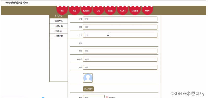 个人中心, 用户在个人中心页面可通过输入账号、密码、姓名、性别、手机、身份证、邮箱、上传图片、余额充值等内容进行更新信息或查看我的发布、我的订单、我的地址、我的收藏等内容,如图5-4所示。