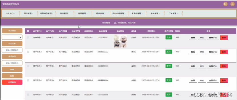商品管理, 管理员可在商品管理页面查看商户账号、商户名称、商户地址、商品类型、商品名称、商品条码、商品图片、库存、上架日期、是否支付、价格等内容,还可进行添加、修改、查看评论或删除等操作,如图5-12所示。