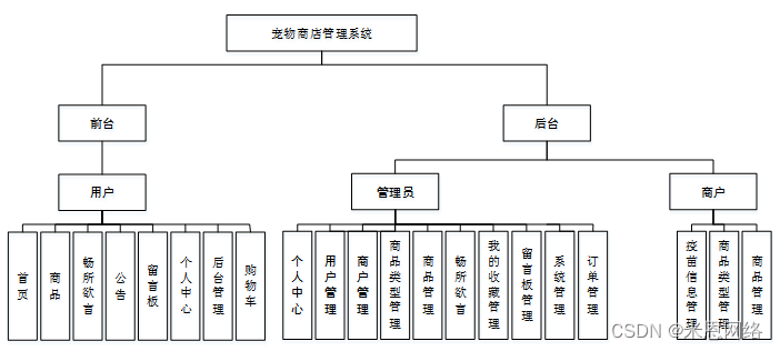 系统功能结构图是系统设计阶段,系统功能结构图只是这个阶段一个基础,整个系统的架构决定了系统的整体模式,是系统的根据。宠物商店管理系统的整个设计结构如图3-1所示。