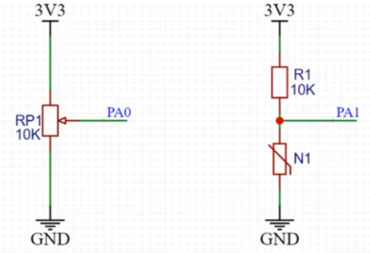 对应电位器接线图:电位器中间引脚接PA0,左右引脚分别接地和接正极