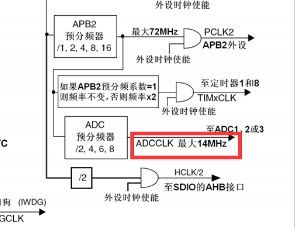 下图是RCC的时钟树,上面写着ADCCLK最大是14Mhz,其中stm32f10x系列的最大时钟频率是72Mhz,也就是最大只能是6分频,72/6=12Mhz,所以虽然始终书上说最大是14Mhz,但是最大可以达到的却只有12Mhz。