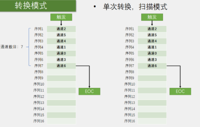 扫描模式用到序列列表,每个通道可以任意指定,并且可以重复。但是规则组单次只能传输一个通道的数据,所以为了防止数据被覆盖,需要用DMA对数据进行转运,当通道全部转换完成后,产生EOC信号。