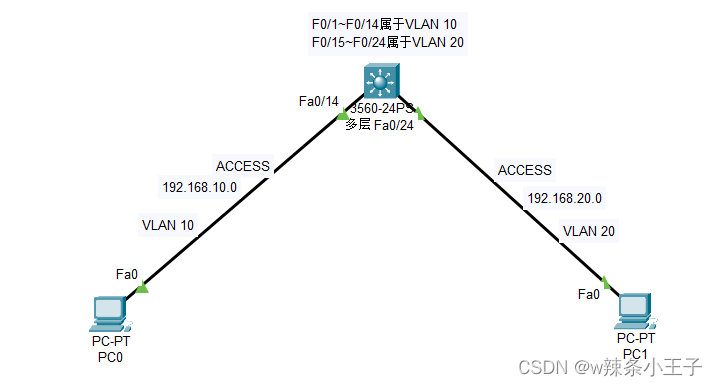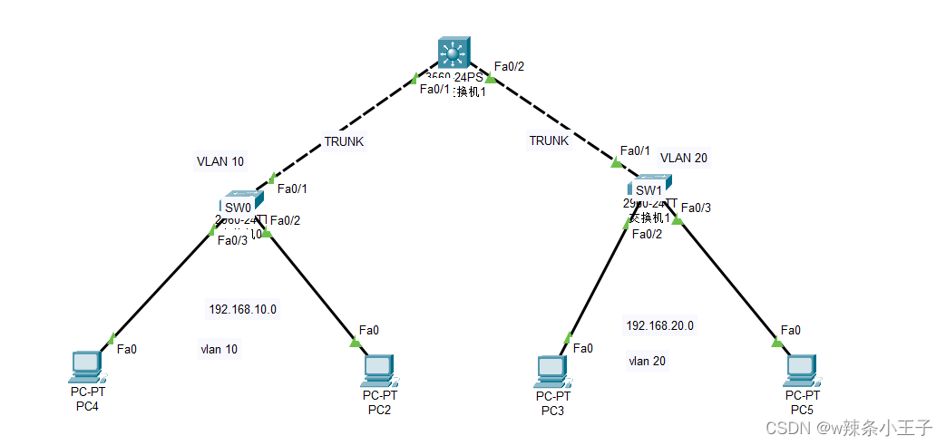 Pc4发送数据到pc5 到达sw0 打上vlan 10标签,发现是不同网段的,将数据发往三层交换机,到达三层交换机,查看目的IP,发现是发往vlan 20的数据,会将标签转换为vlan 20 重新进行二层封装,后通过对应接口转发给sw1 sw1收到数据后通过对应接口转发给pc5