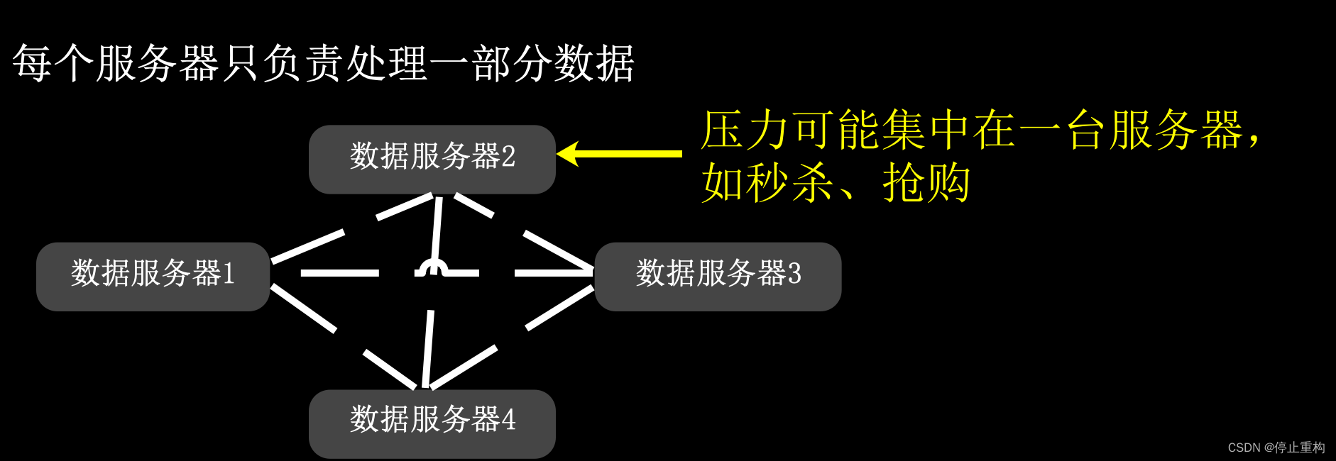 理论上会分摊所有数据的操作压力,但是如果压力集中在其中一部分数据呢 ?例如限时抢购等场景, 则其实压力仍然会集中在一台服务器上。