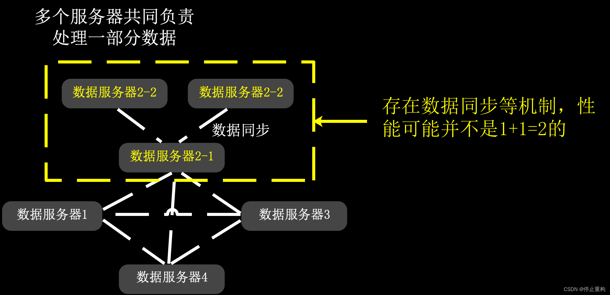 即使是多台服务器同时负责一部分数据的集群方案,也会由于数据同步等机制,以至于集群的性能可能没有想象中高。