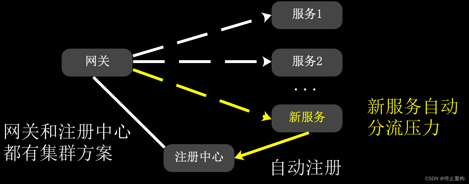 以SpringCloud为例: 新启动的服务自动连接到注册中心就可以分流压力了, 理论上一台后端服务器性能不足,扩展一台就可以了。