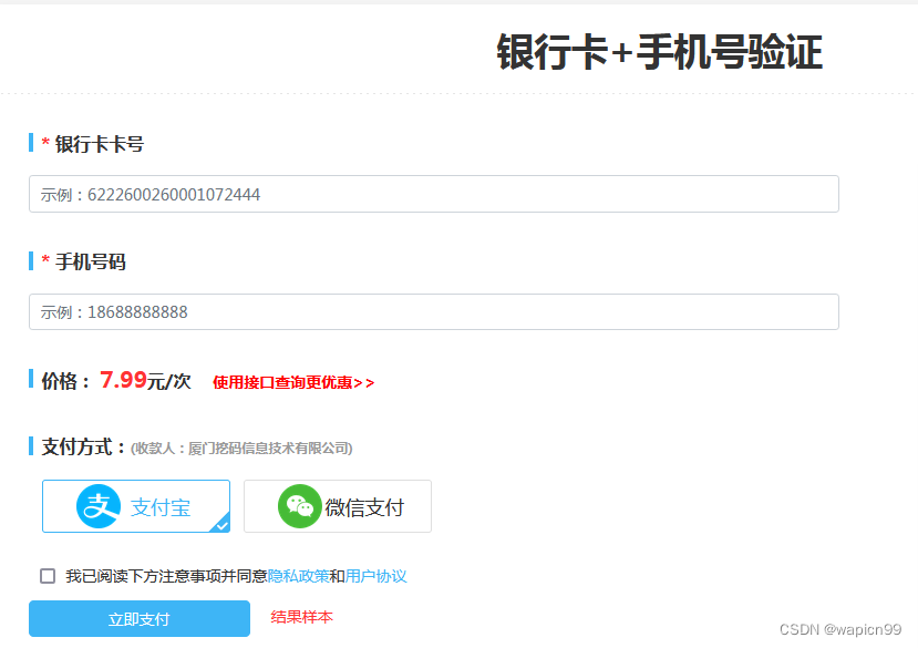 银行卡四要素验证:姓名+身份证号+卡号+手机号码