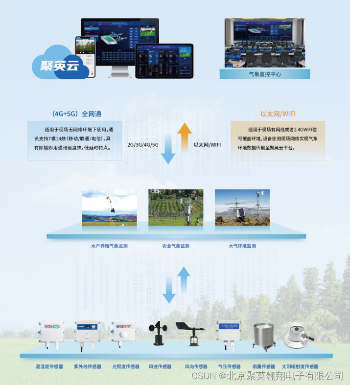 智能农业气象站通过传感器获取气象数据,再利用无线或有线网络,经防雨控制柜上传送到云平台,使用者用手机APP、电脑网页/软件等终端形象查看气象数据。实现对农牧业气象数据监控,监测内容包括:CO2、气压、雨量、风速、风向、光照度、空气温湿度、土壤温湿度、PM2.5/PM10等。具体监测气象参数根据当地气象特征、作物种类而定。