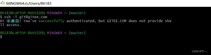 添加公钥后查看是否配置成功 ssh -T git@gitee.com