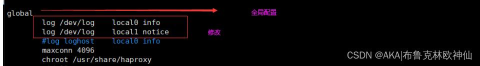 --4~5行--修改,定义haproxy日志输出设置和日志级别,local0为日志设备,默认存放到系统日志