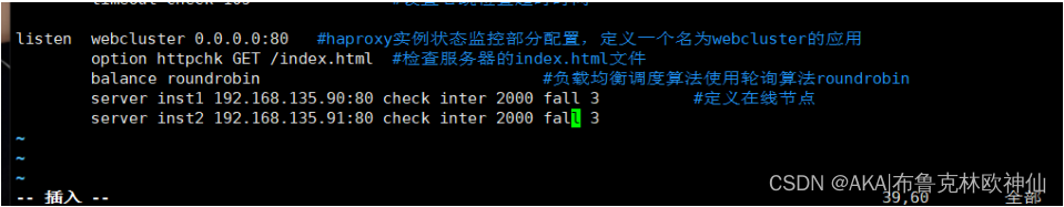 server inst1 192.168.135.90:80 check inter 2000 fall 3 #定义在线节点