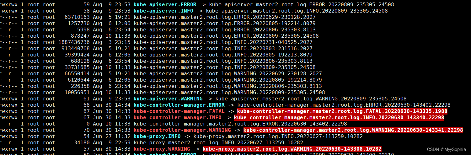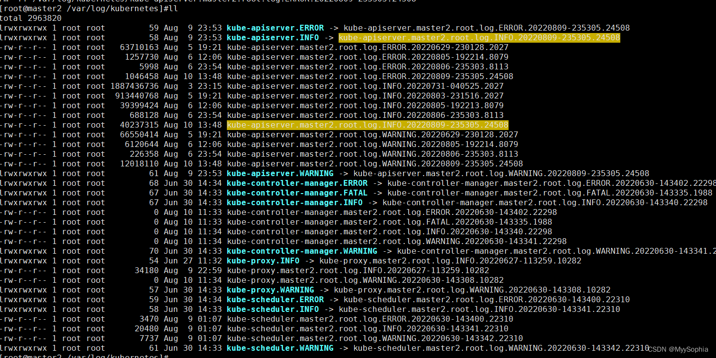 kubernetes 二进制安装,各组件的log目录在/var/log/kubernetes中,其中各组件的日志均是一个软链接,指向当前的日志目录。当日志超过3.6GB,k8s会自动重新指向最新的log。