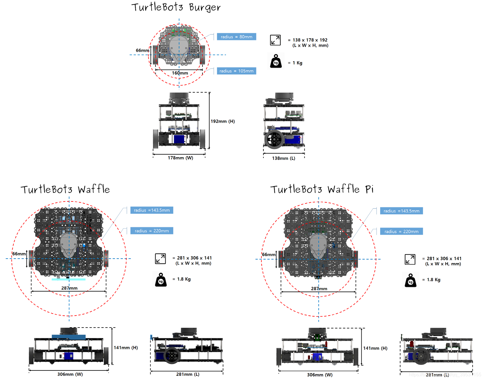 TurtleBot3 是一个小型,低成本,完全可编程,基于 ROS 的移动机器人。它旨在用于教育,研究,产品原型和爱好应用的目的。TurtleBot3 的目标是大幅降低平台的尺寸和价格,而不会牺牲性能,功能和质量。由于提供了其他选项,如底盘,计算机和传感器,TurtleBot3 可以通过各种方式进行定制。TurtleBot3 应用 了SBC(单板计算机),深度传感器和 3D 打印的最新技术进步等技术。