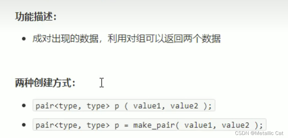 2.pair对组的本质也是类模板容器,只不过使用它的时候不需要我们包含什么头文件。这个pair类模板中有两个成员属性,第一个成员属性的类型是 type1 ,第二个是 type2