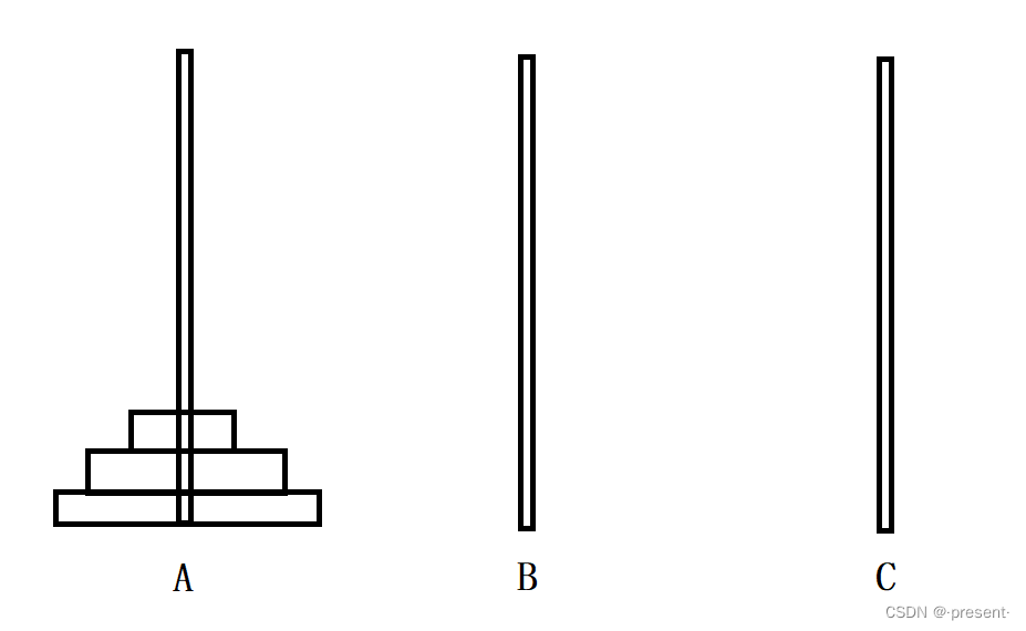 如图所示,这里只列举了只有三个金盘的情况,目标则是在保证移动过程中,小金盘始终在大金盘之上,然后将A杆上的金盘全部移动到C杆上.