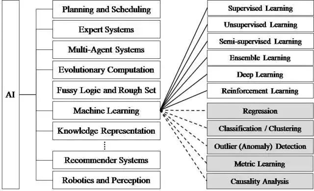 人工智能的研究领域也在不断扩大,图一展示了人工智能研究的各个分支,包括专家系统、机器学习、进化计算、模糊逻辑、计算机视觉、自然语言处理、推荐系统等。