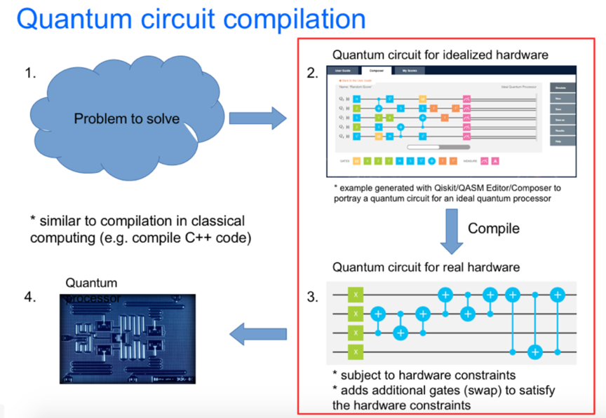 编译量子电路需要添加额外的门,这些门将量子位状态移动到所需的门可以在实际量子处理器的物理约束下作用于它们的位置。在某种程度上,这类似于如何将经典程序从程序员理解的语言(例如,C++)编译成硬件可以执行的二进制表示。下图是量子编译过程的示例。
