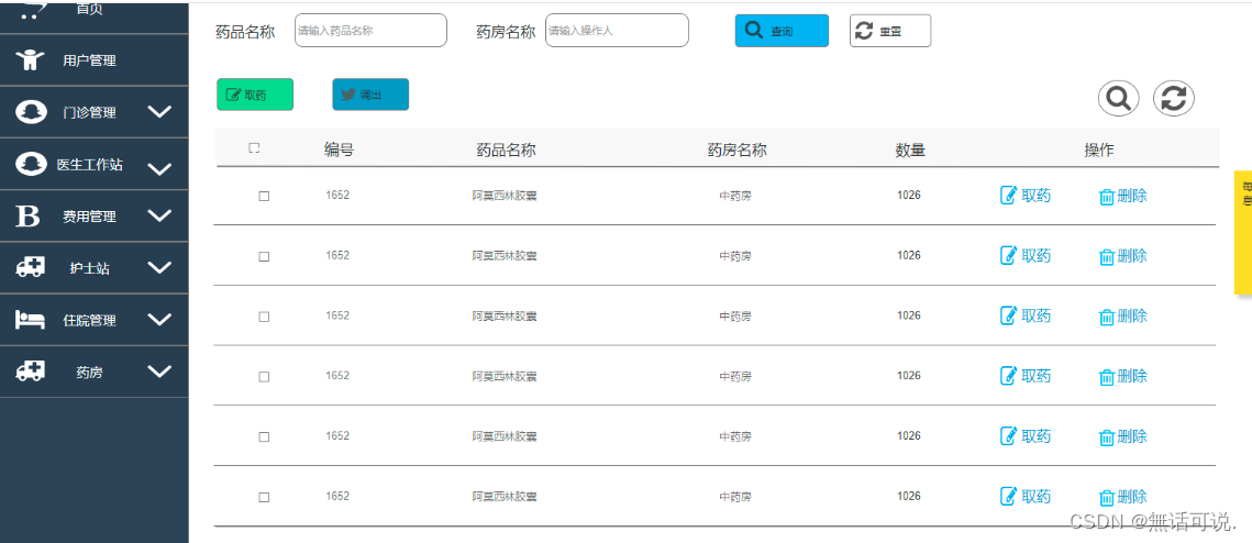 病房记录:新增、修改、删除、查询、重置