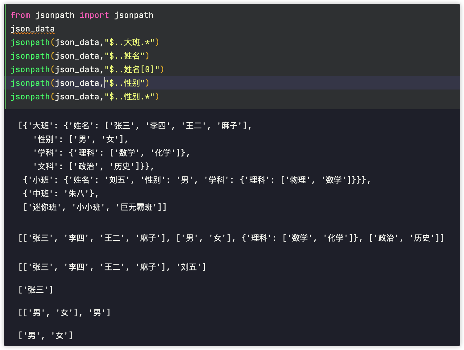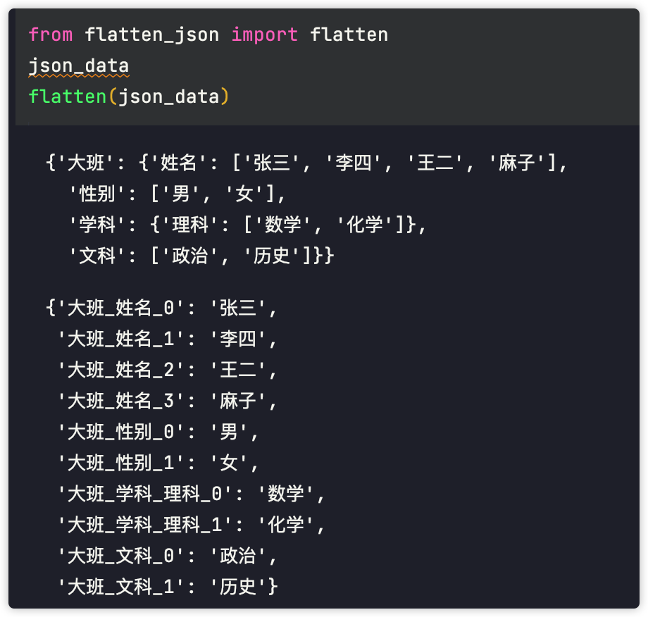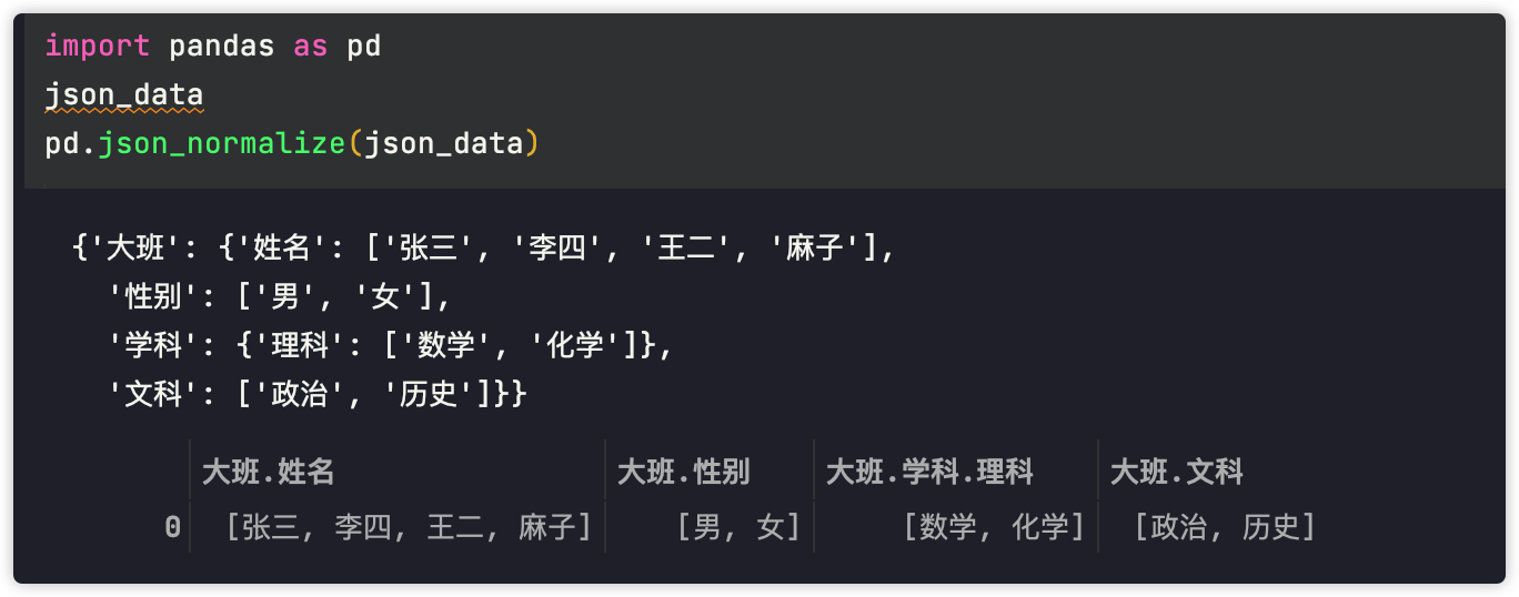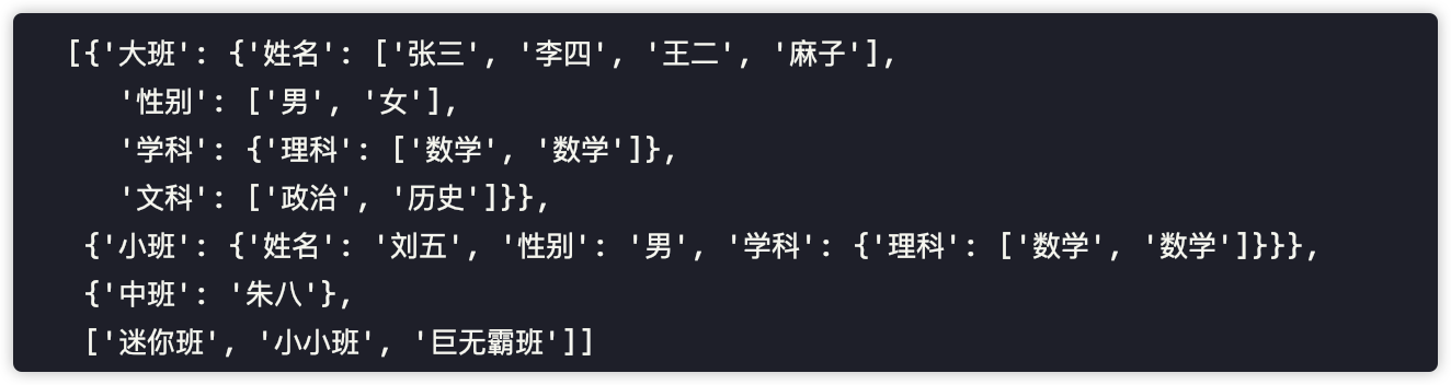 这是文件中的json数据: [{'大班': {'姓名': ['张三', '李四', '王二', '麻子'], '性别': ['男', '女'], '学科': {'理科': ['数学', '数学']}, '文科': ['政治', '历史']}}, {'小班': {'姓名': '刘五', '性别': '男', '学科': {'理科': ['数学', '数学']}}}, {'中班': '朱八'}, ['迷你班', '小小班', '巨无霸班']]