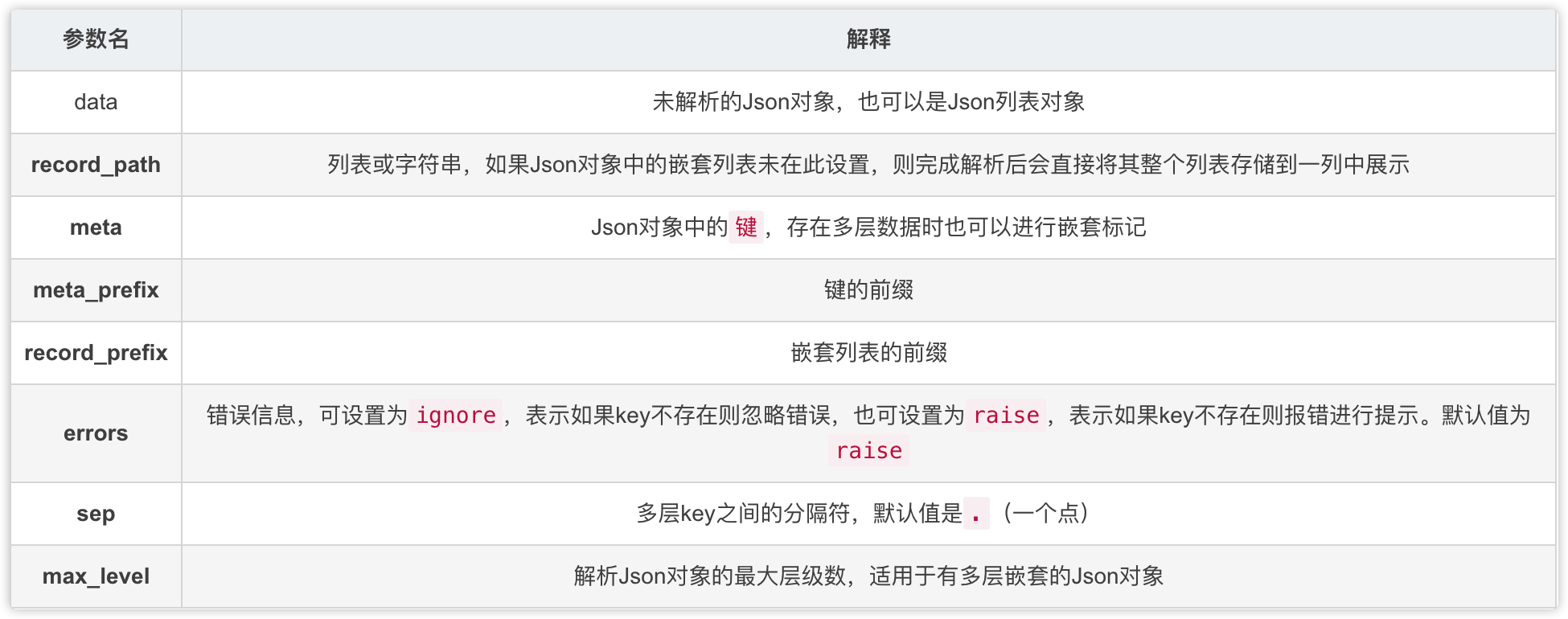 这是json_normalize的参数,可以看出功能pandas在json解析方面的功能也很强大几乎覆盖了所有解析JSON的场景