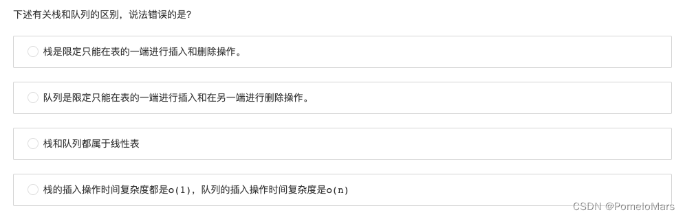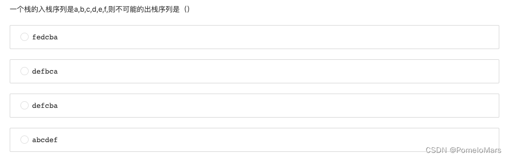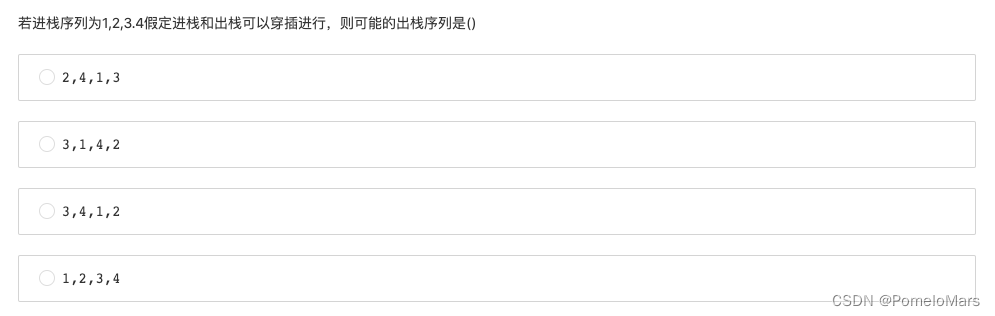 - 第一选项:正确,像出栈顺序和入栈顺序完全相反和完全一样的选项都是对的,一个是全部都放进去再全都拿出来,一个是放进去就拿出来