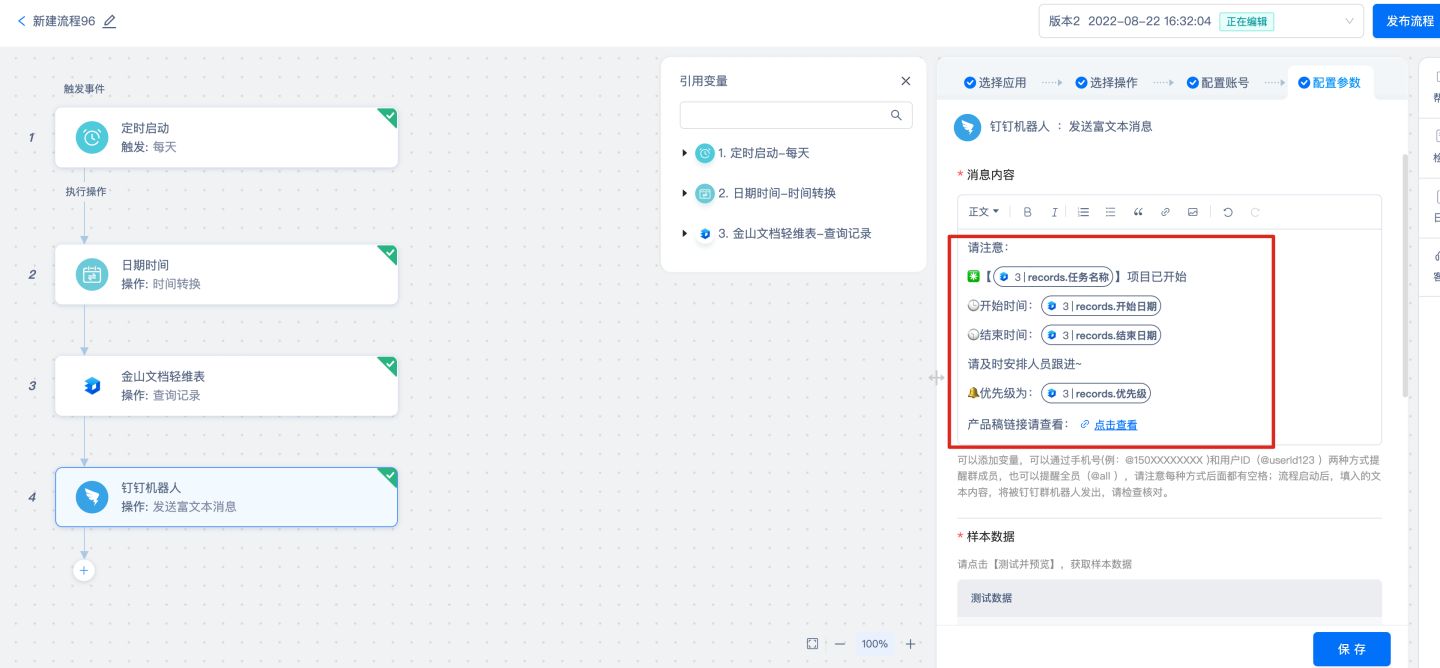 利用腾讯云HiFlow场景连接器,连接金山文档轻维表和企业微信、飞书、钉钉等企业应用,在项目开始时,自动发送提醒。