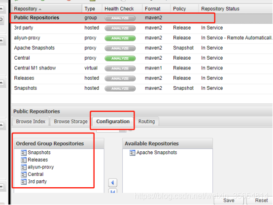 将多个仓库组合起来一起使用,只需引入一个仓库组地址即可享用多个仓库资源。左边是已加的仓库,右边是可用仓库(需要就把右边-挪到-左边 )