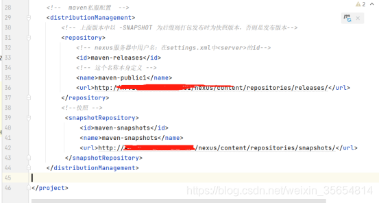 maven 打包代码到私服根据version 后面是否带有“-SNAPSHOTS” 来区分是打包线上版本还是快照版本,如果带有“-SNAPSHOTS” 打包快照版本,否则即为线上版本。发布地址分别对应快照仓库snapshots和正式仓库releases。