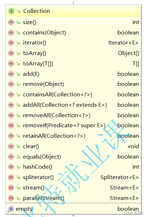 Collection也是一个接口,该接口中规范了后序容器中常用的一些方法,具体如下所示: