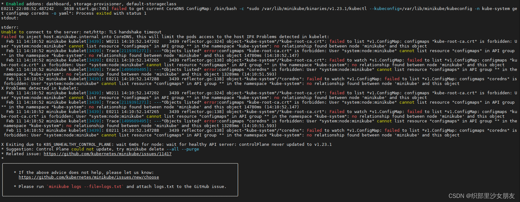 6、至此本来应该是部署完毕的,但是下一次开机启动K8S时却发现报错,仔细看了下提示,说的控制面异常,导致启动失败?