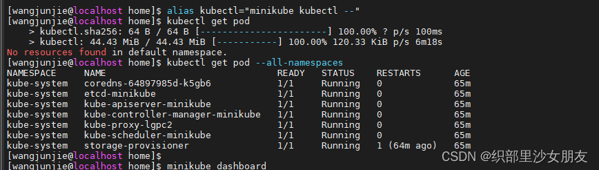 5、然后根据提示下载迷你K8S的kubectl,使用命令 minikube kubectl -- get po -A,可查看当前运行的pod