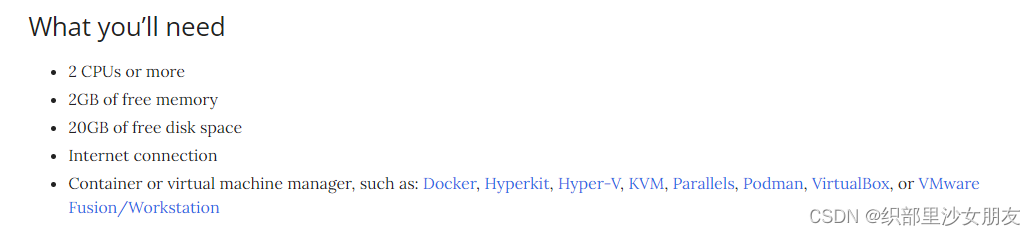 迷你K8S环境的安装要求和安装步骤相见如下说明,示例操作系统为centOS7https://minikube.sigs.k8s.io/docs/start/