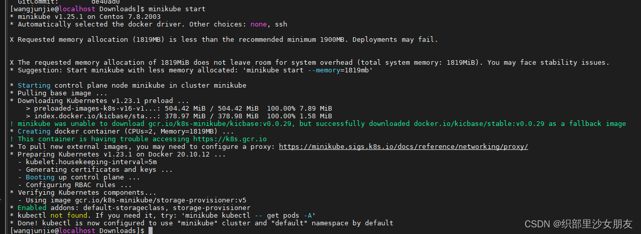 5、安装比较顺利,结束以后,直接使用命令minikube start,启动迷你K8S集群