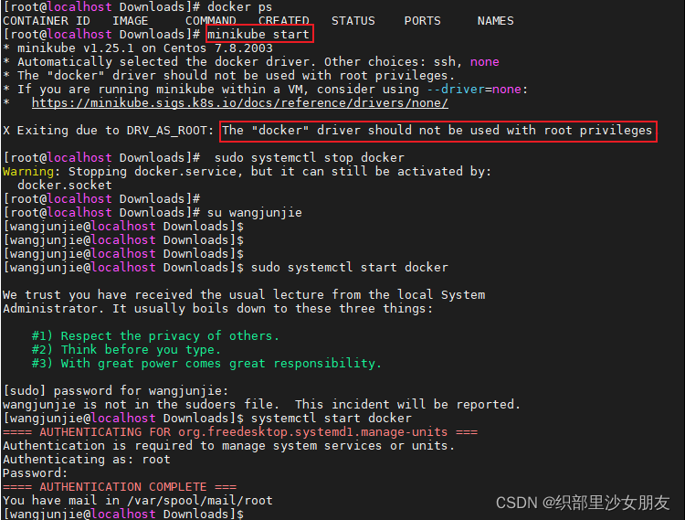 2、启动docker时注意不要直接使用root用户启动,否则迷你K8S启动会报错,使用命令 sudo systemctl start docker