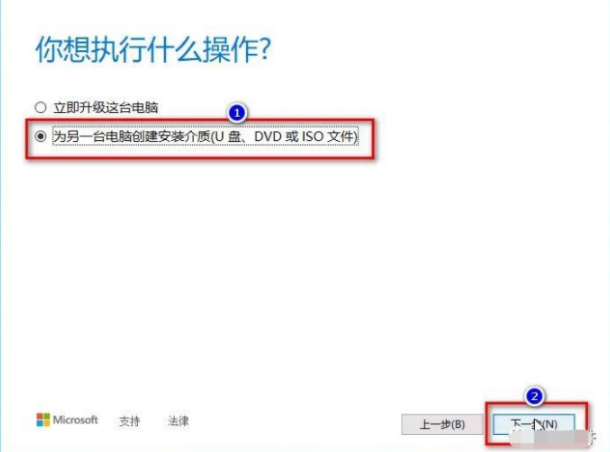 3、选择“为另一台电脑创建安装介质(U盘、DVD或者ISO文件)”,进入“下一步”。