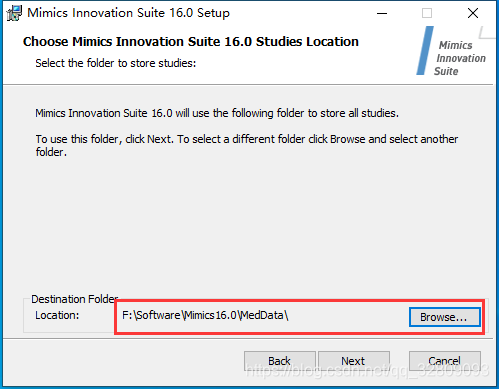 7、选择 next ——> 在 F:\Software\Mimics16.0 目录下新建一个文件夹 MedData ——> 选择该目录 F:\Software\Mimics16.0\MedData