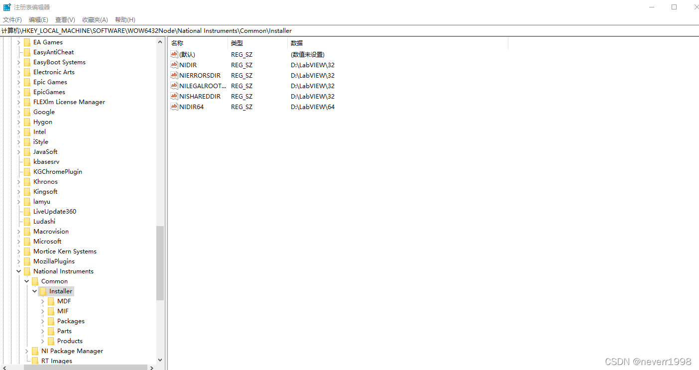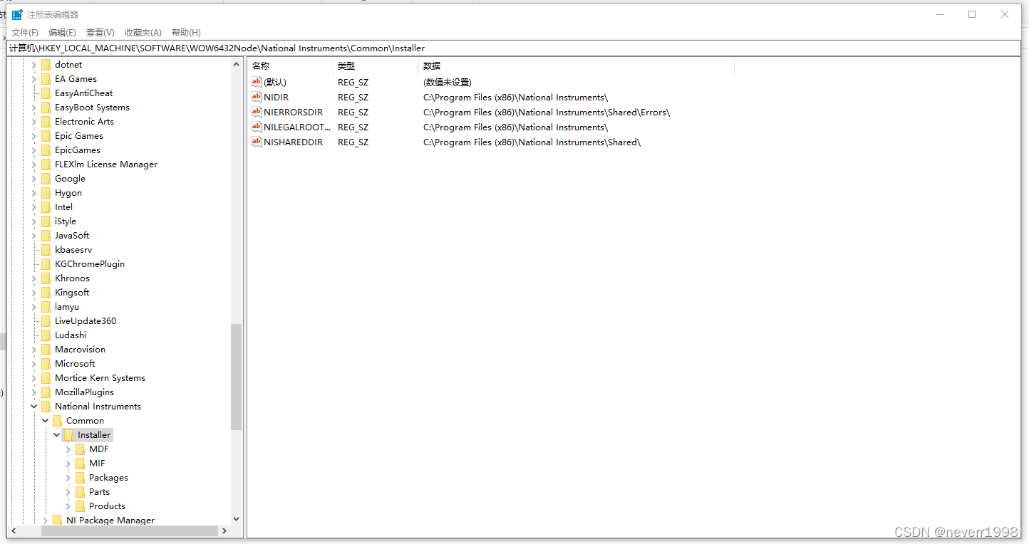 3、在注册表编辑器上找到:HKEY_LOCAL_MACHINE\SOFTWARE\WOW6432Node\National Instruments\Common\Installer